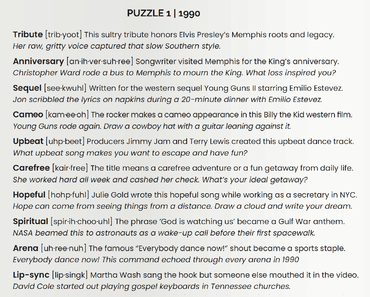 Perfect for road trips, parties, game nights, or a solo trip down memory lane. One hint, one puzzle, one throwback at a time.